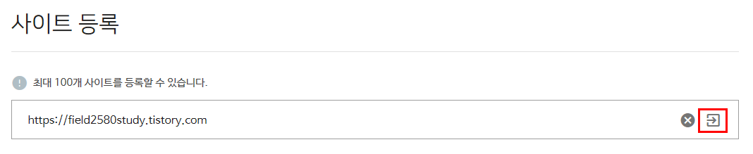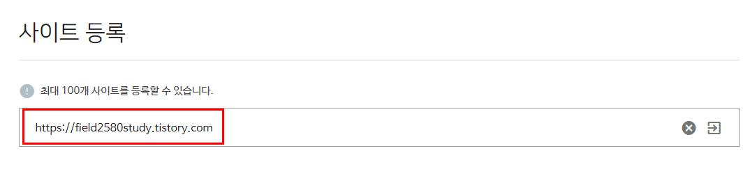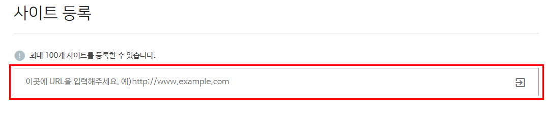 사이트 등록 메뉴에서 최대 100개 사이트를 등록할 수 있습니다. 밑에 이곳에 URL을 입력해 주세요.라는 빈칸이 있습니다. 이 곳에 티스토리 블로그 주소를 복사해서 붙여넣기 하시면 됩니다.