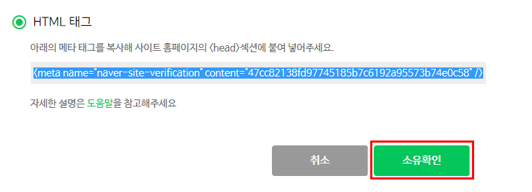 HTML 태그를 체크한 후 아래 메타 태그를 복사해줍니다.