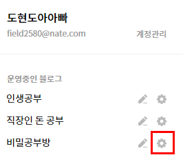 티스토리 블로그 중에서 네이버 서치어드바이저를 등록할 블로그를 선택해서 설정(톱니바퀴 모양)을 눌러줍니다.