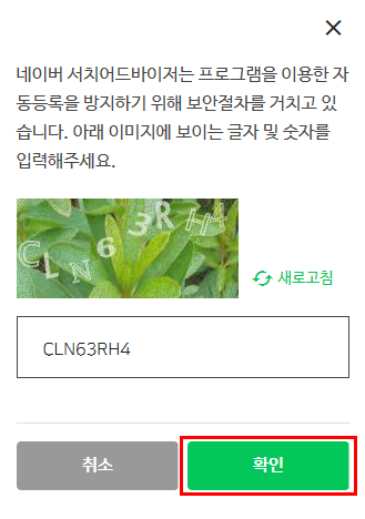 네이버 서치어드바이저는 프로그램을 이용한 자동등록을 방지하기 위해 보안절차를 거치고 있습니다. 아래 이미지에 보이는 글자 및 숫자를 입력해주세요. 라는 안내창이 뜨면 사진속에 있는 글자를 입력 후 확인을 눌러줍니다.