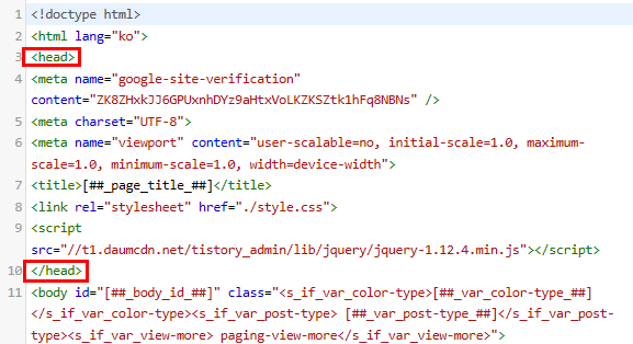 <head> ~ </head>를 찾아줍니다. <head>사이에 위에 복사한 메타 태그를 복사해 붙여넣으시면 됩니다.