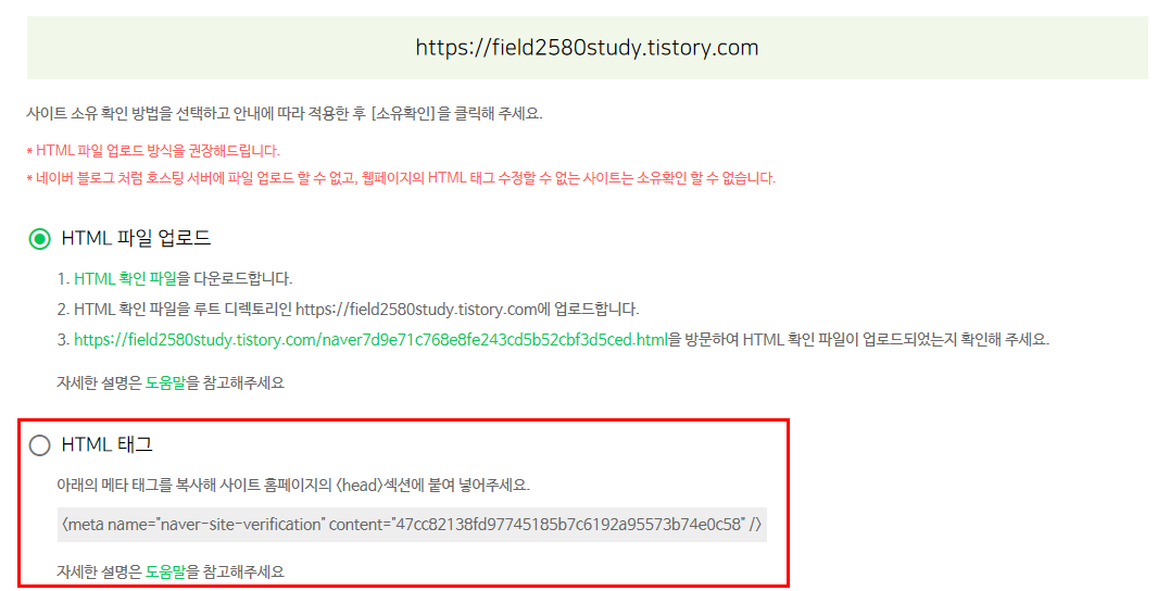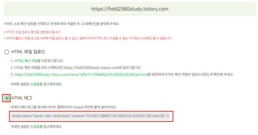 해당 블로그가 내 블로그가 맞는지 확인하는 과정을 거쳐야합니다. 대표적인 방법으로는 HTML 파일을 다운받아서 내 블로그에 업로드 시켜서 확인하는 방법이 있고, HTML 태그를 이용하여 메타 태그를 복사해 사이트 홈페이지에 <head>섹션에 붙여 넣어서 소유 확인을 하는 방법이 있습니다. HTML 태그를 이용해서 소유확인하는 방법이 더 쉬우니 이번 포스팅에서는 HTML 태그를 이용해서 소유확인하는 방법을 알아보겠습니다.