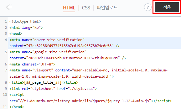 메타 태그를 붙여넣기 하셨다면 우측 상단에 적용버튼을 눌러주시면 됩니다.