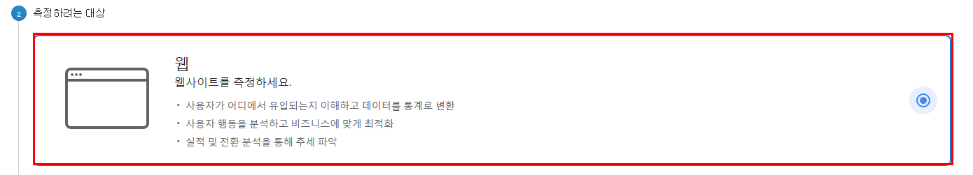 다음으로는 애널리틱스로 측정하려는 대상을 설정해주어야합니다. 블로그는 웹이니 3개의 메뉴 중에 최상단에 있는 웹 메뉴를 선택해 준 후 다음 버튼을 눌러줍니다.