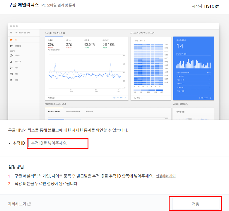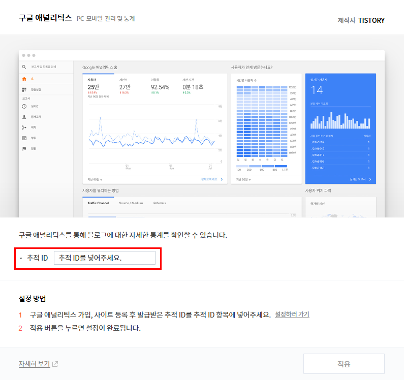 티스토리 플러그인 메뉴에 있는 구글 애널리틱스를 누르면 위와같은 화면이 뜨게됩니다. 아래에 있는 추적 ID를 입력하는 칸이 있는데, 추적 ID는 구글 애널리틱스 홈페이지를 통해서 발급받을 수 있습니다.