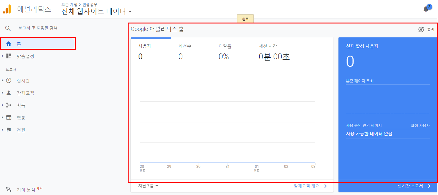 애널리틱스에 새로운 계정을 생성한 즉시 리포터가 바로 보고되지 않고 시간이 지난 후에 리포트가 뜨게 되니 기다리시면 완료됩니다.