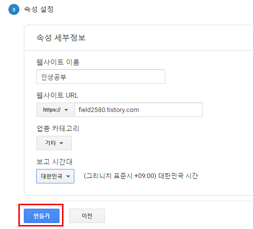 속성 정보를 자세히 입력해주어야합니다. 웹 사이트이름은 위와 동일하게 제 티스토리 블로그 이름인 인생공부로 하였습니다.