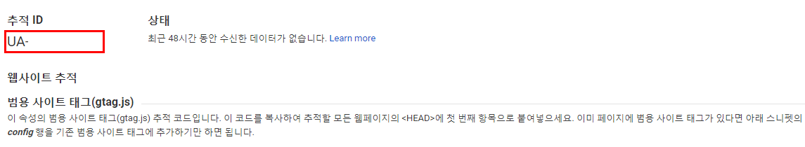 동의함 버튼을 누르면 위와 같은 화면이 뜹니다. 좌측상단에 추적 ID가 생성된 것을 확인 할 수 있습니다. 이 아이디를 처음에 티스토리 플러그인 애널리틱스 화면에서 보았던 추적 ID 빈칸에 입력해주시면 됩니다.