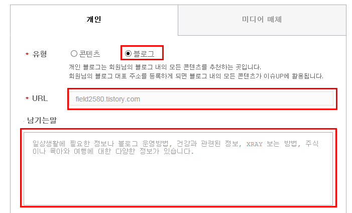 유형에는 블로그를 선택해 준 후, URL은 내 티스토리 블로그 주소를 넣어줍니다. 남기는 말에는 간단하게 내 블로그 소개를 하거나 본인이 네이트 이슈UP 운영자에게 어필하고 싶은 내용을 적으시면 됩니다.