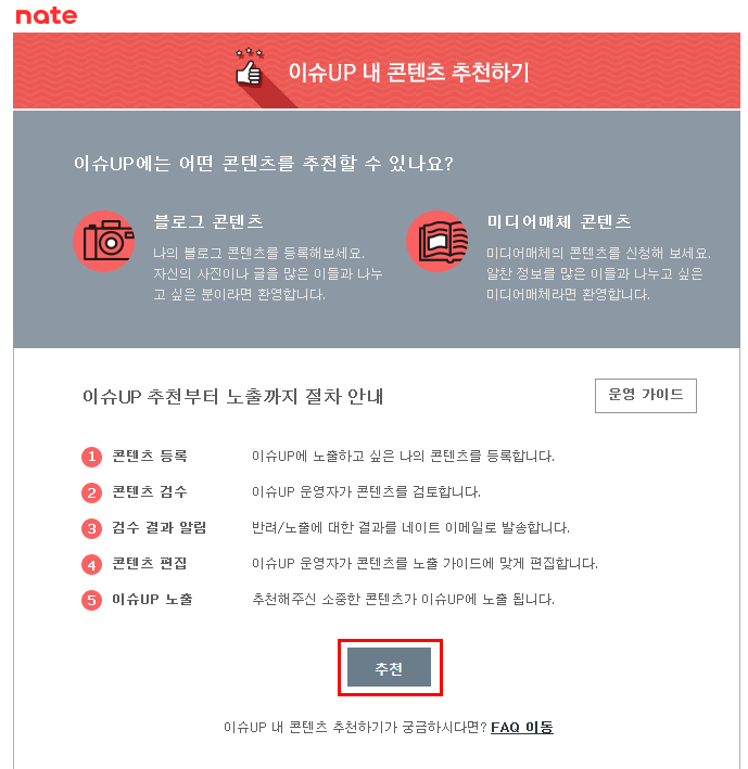 이슈UP추천을 누르면 이슈UP에 노출될 내 컨텐츠들을 추천할 수 있습니다. 컨텐츠를 등록하면, 운영자가 콘텐츠를 검수하고, 검수 결과를 알려줍니다. 이때 반려될지 노출될지에 대한 결과를 네이트 이메일로 발송해줍니다. 그 후에 운영자가 콘텐츠를 노출 가이드에 맞게 편집합니다. 그리고 추천한 콘텐츠가 이슈 UP에 노출하게 됩니다.