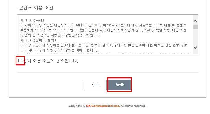 내용을 적으신 후 콘텐츠 이용조건에 동의한 후 등록버튼을 눌러주면 네이트 이슈UP 등록을 마치게 됩니다.