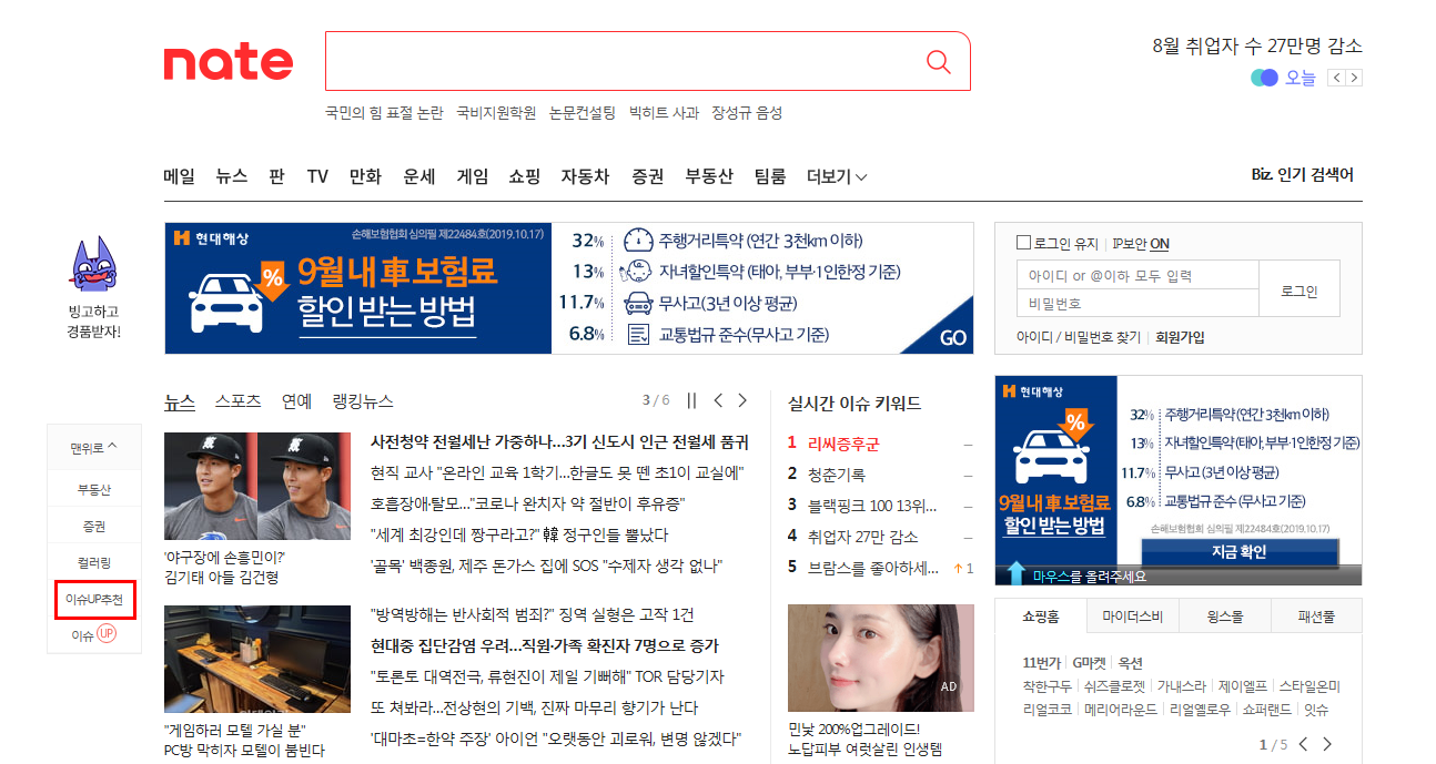 네이트의 경우 이슈UP이라는 코너에서 내 블로그의 컨텐츠나 글들을 노출 시킬 수 있습니다. 이슈UP은 네이트 홈페이지 중간쯤에 있습니다.