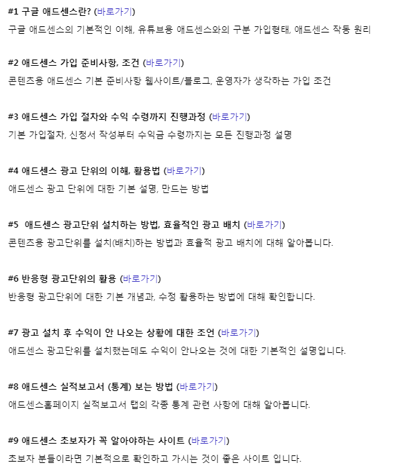 초보자 가이드에서는 애드센스에 대해서 자세히 설명해줍니다. 특히 초보자들이 알고싶어하는 액기스들만 모아서 정말로 잘 정리해놨습니다. 특히 애드센스를 달기위한 조건, 효율적인 광고 배치부터 애드센스 초보자가 꼭 알아야하는 사이트부터 애드센스에 관한 모든 정보를 알려줍니다. 저도 처음에 구글 애드센스에대해서 아무것도 몰랐을 때 이 곳에서 모든 내용을 읽어보고 제 블로그에 적용하였습니다. 구글 애드센스를 하시는 분이라면 꼭 한번씩은 모두 다 읽어보시기를 추천해드립니다.