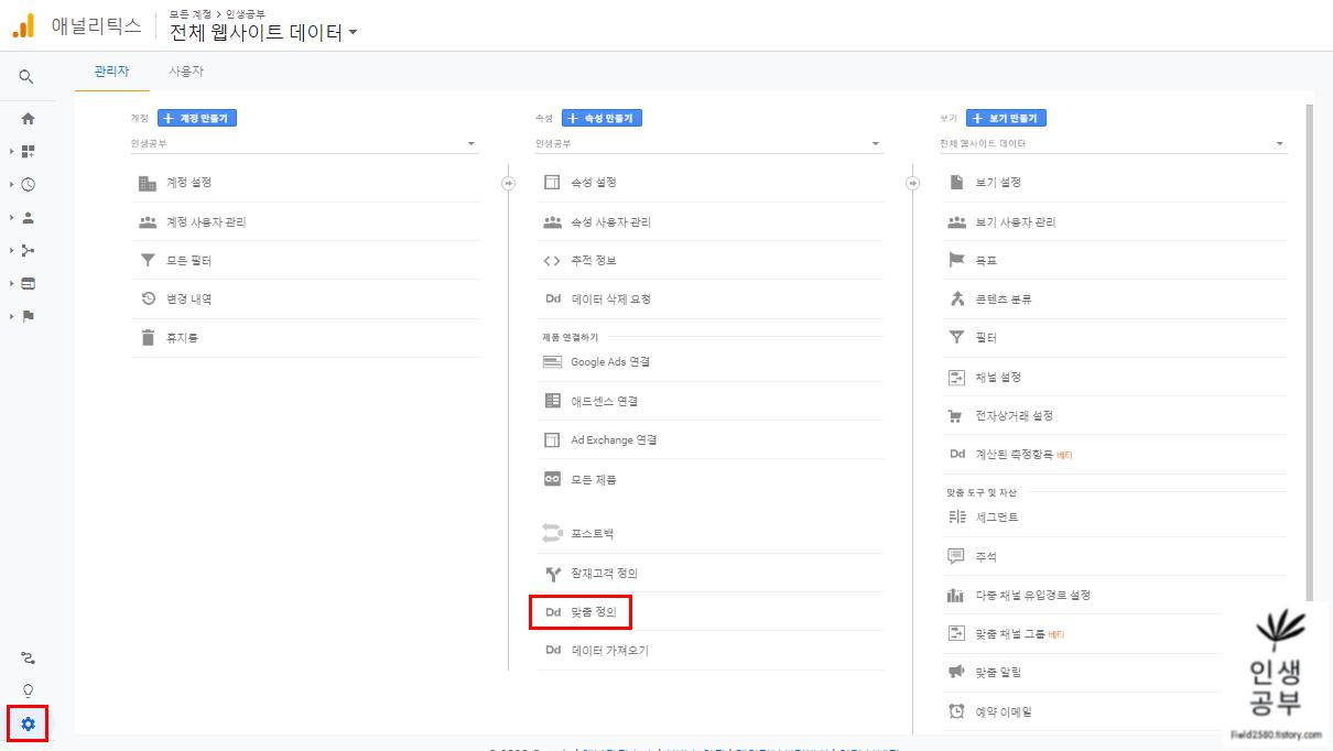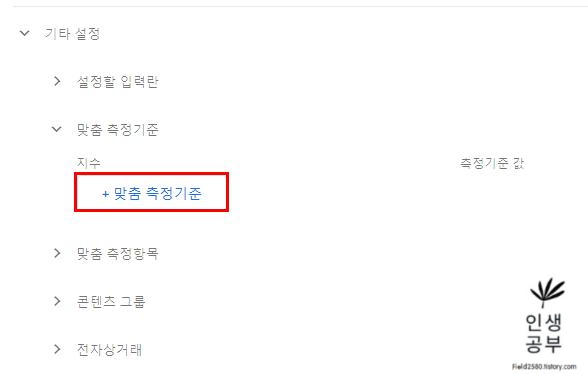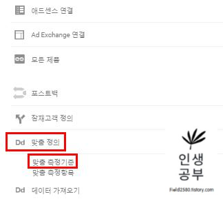 맞춤 정의 -> 맞춤 측정기준 항목을 선택해서 눌러줍니다.