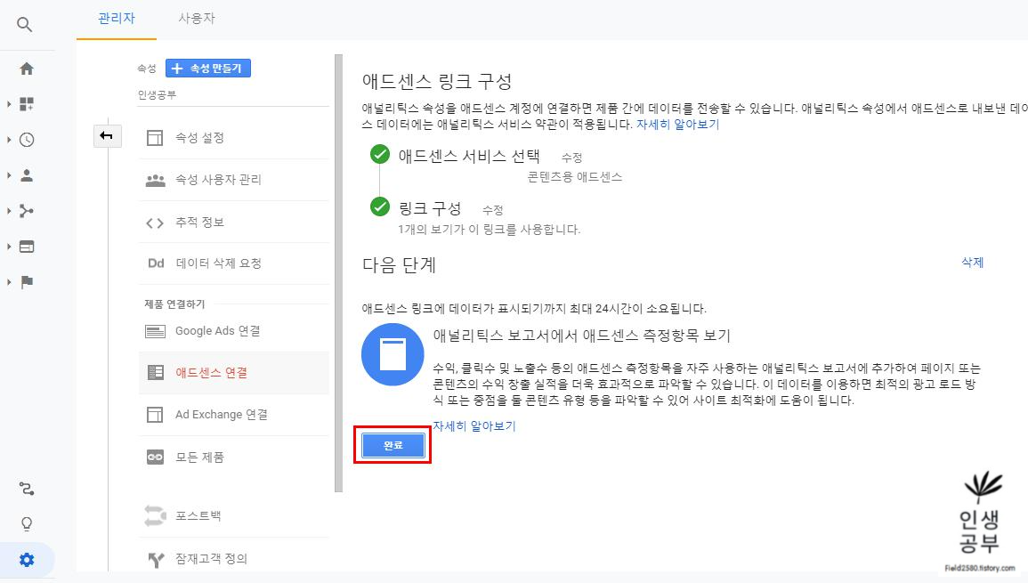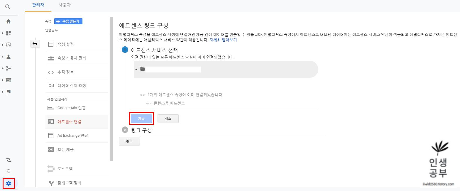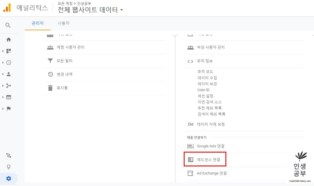 이제 가장 중요한 일을 할 차례입니다. 애드센스 계정과 연결해주어야하는데 애널리틱스 설정-> 계정 연결하기-> 애드센스 연결을 눌러줍니다.
