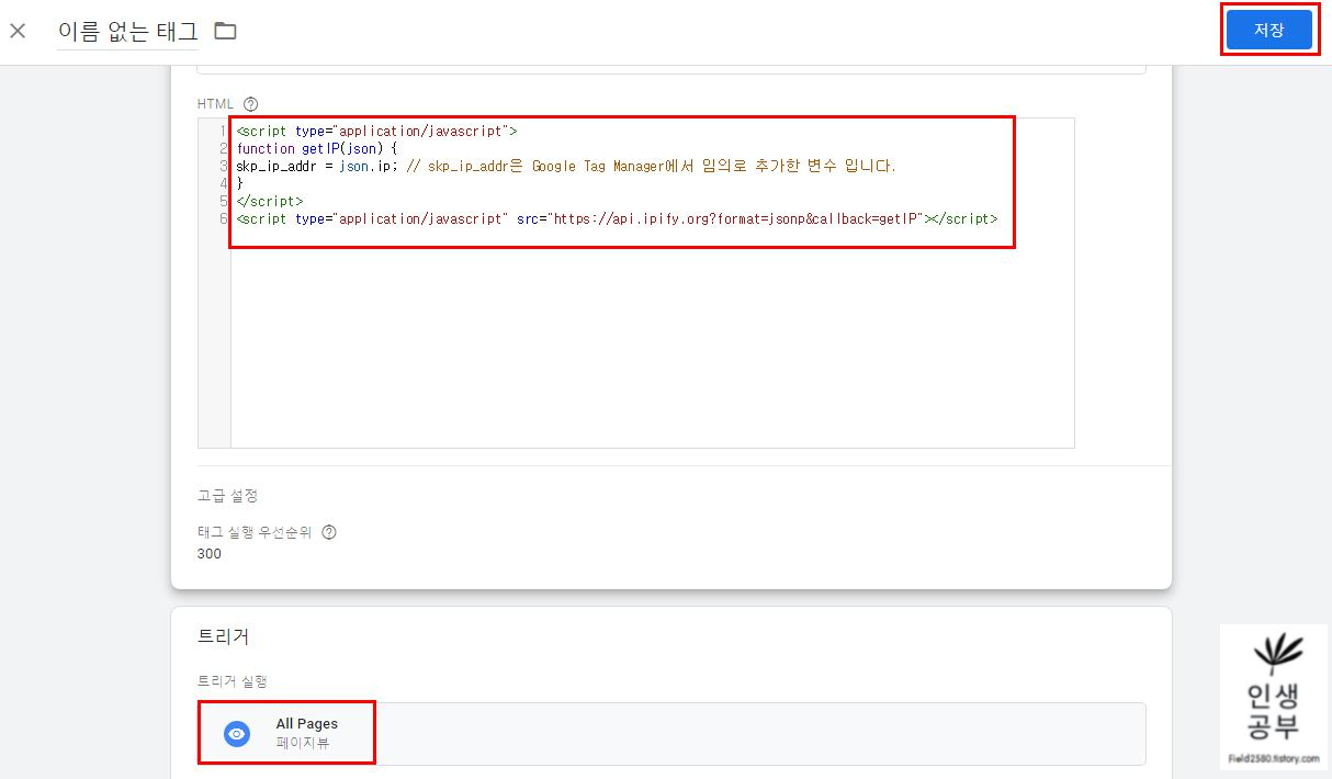 HTML항목에 코드를 제대로 복사한 것을 확인하고 아래 트리거에 All Page가 선택되었으면 저장 버튼을 눌러줍니다.