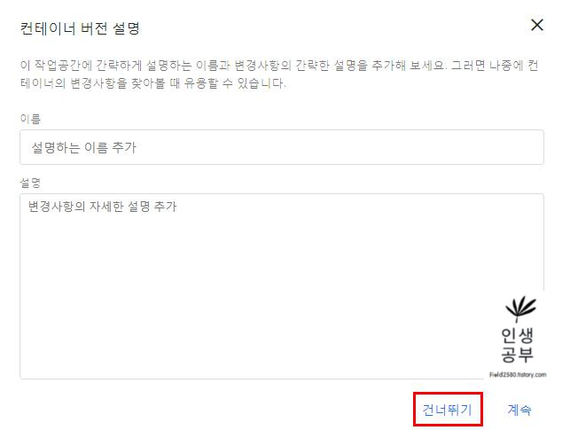 컨테이너 버전 설명이 나오면 건너뛰기를 눌러주시면 됩니다.