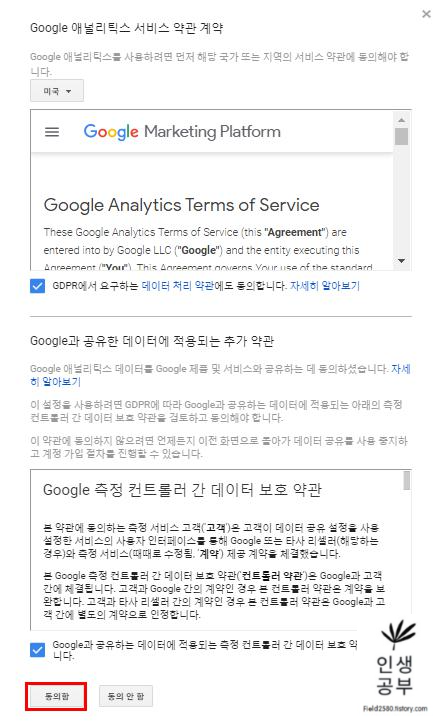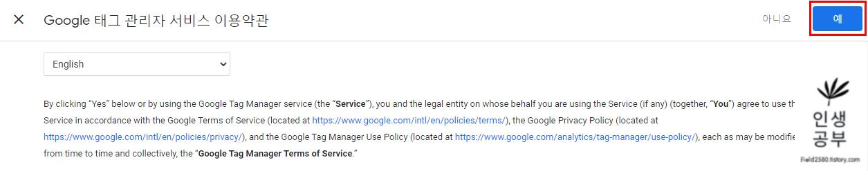 Google 태그 관리자 서비스 약관이 뜨면 우측 상단에 예를 눌러주시면 됩니다.