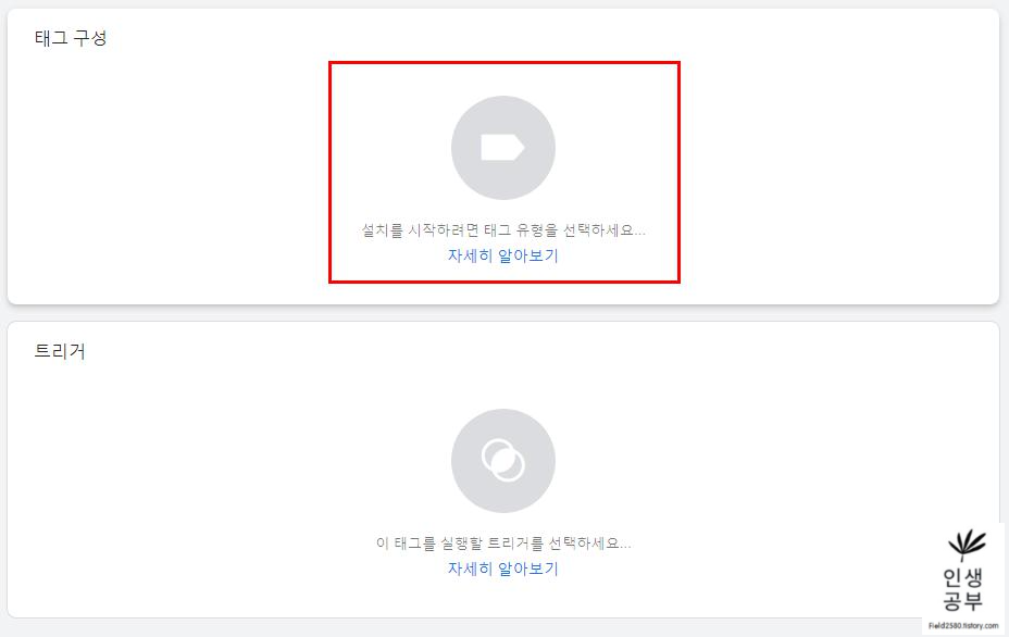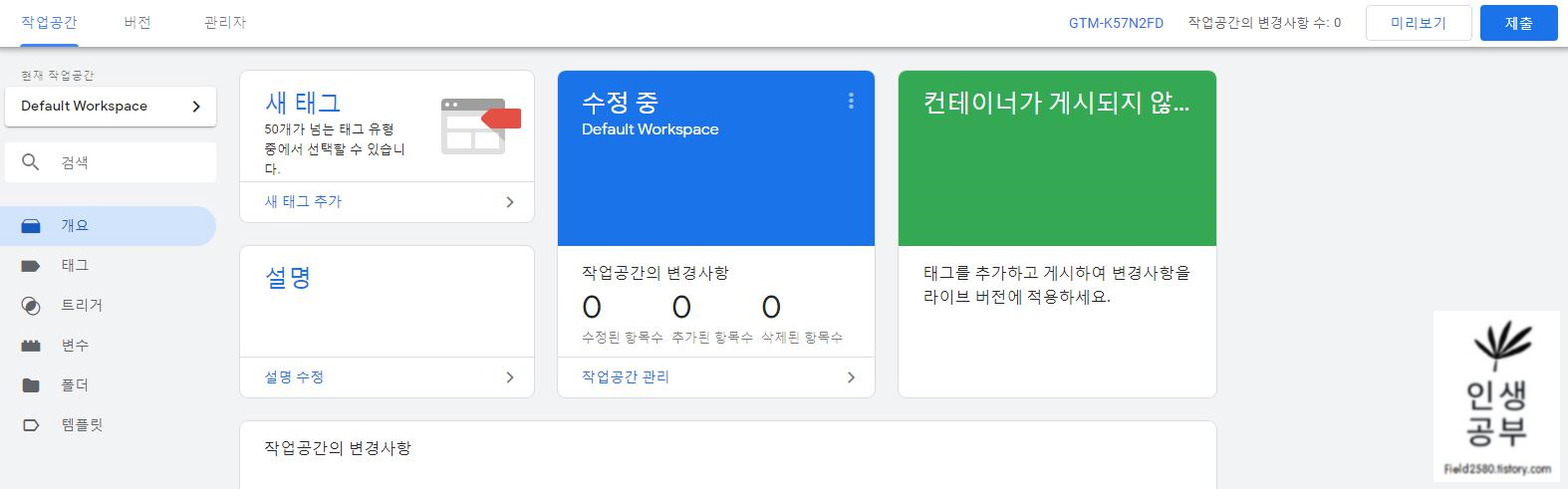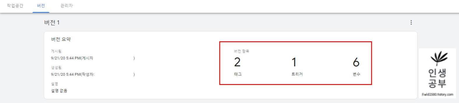 태그 관리자에 위와 같은 화면이 뜹니다. 태그 2, 트리거 1, 변수가 1이 뜰 수도 있고, 저처럼 6이 뜰 수 있는데 크게 신경쓰지 않으셔도 됩니다.
