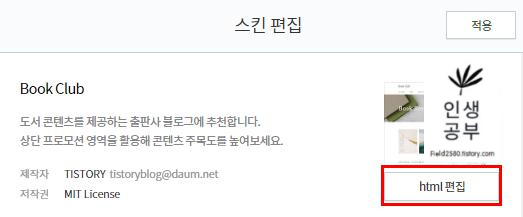 스킨편집 우측 하단에 있는 html편집을 눌러줍니다.