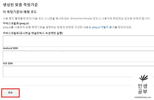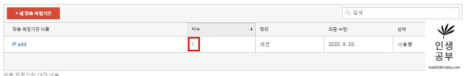 맞춤 측정기준 이름에 아까 만든 IP_addr이 있고, 지수는 1로 나와있습니다. 추후에 입력해야하는란이 있기 때문에 기억해주시기나 메모장에 적어두시길 바랍니다.