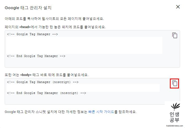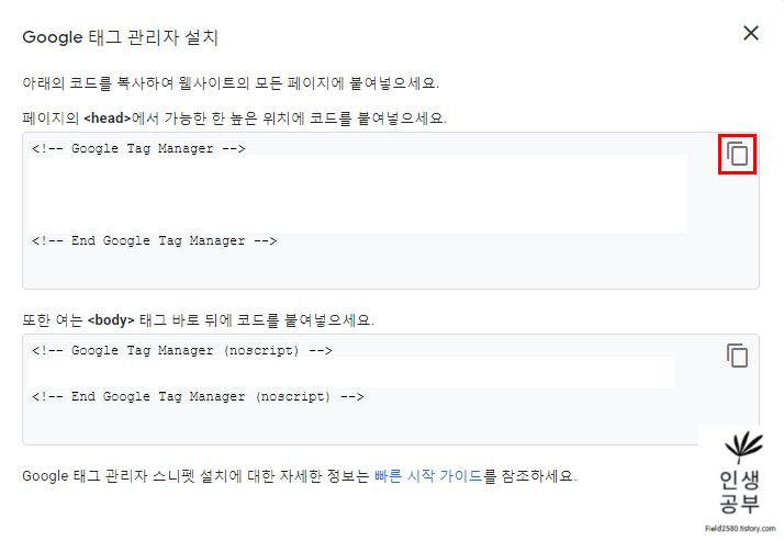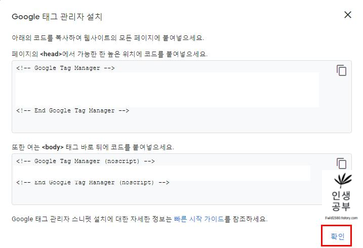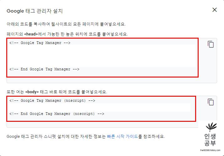 Google 태그 관리자 설치화면이 뜨면 코드가 2개가 생깁니다. 위쪽에 생성된 코드 하나는 <head> 아래에 붙여넣고, 아래에 생성된 코드 하나는 <body> 아래에 붙여넣어주면 됩니다.