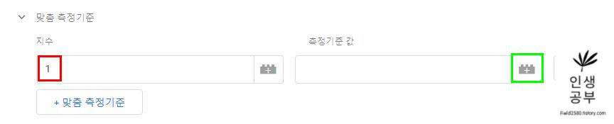 저는 지수가 1이라고 적혀있기 때문에 1을 입력해주면 됩니다. (찾아가는 방법은 애널리틱스 설정 -> 맞춤 정의 -> 맞춤 측정기준을 누르시면 위 화면이 뜨고 지수를 확인하실 수 있습니다.)
