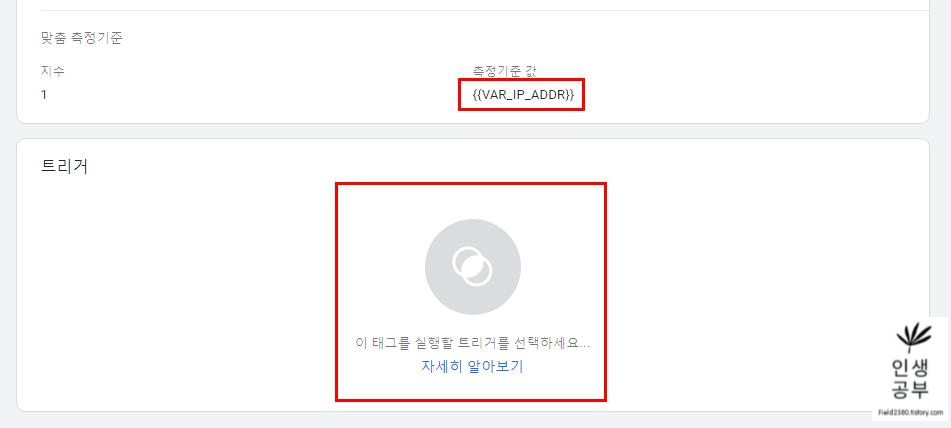 지수를 입력해줍니다. 측정 기준값(초록색 네모)를 누르신후 VAR_IP_ADDR을 선택해주시면 됩니다.