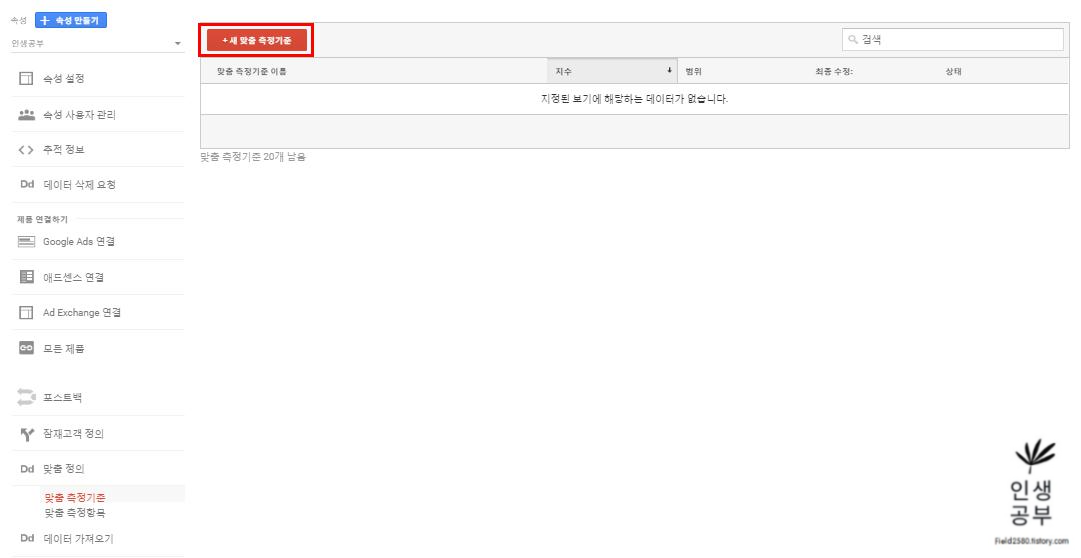 맞춤 측정기준 항목을 누른 후, 새 맞춤 측정기준을 눌러줍니다.