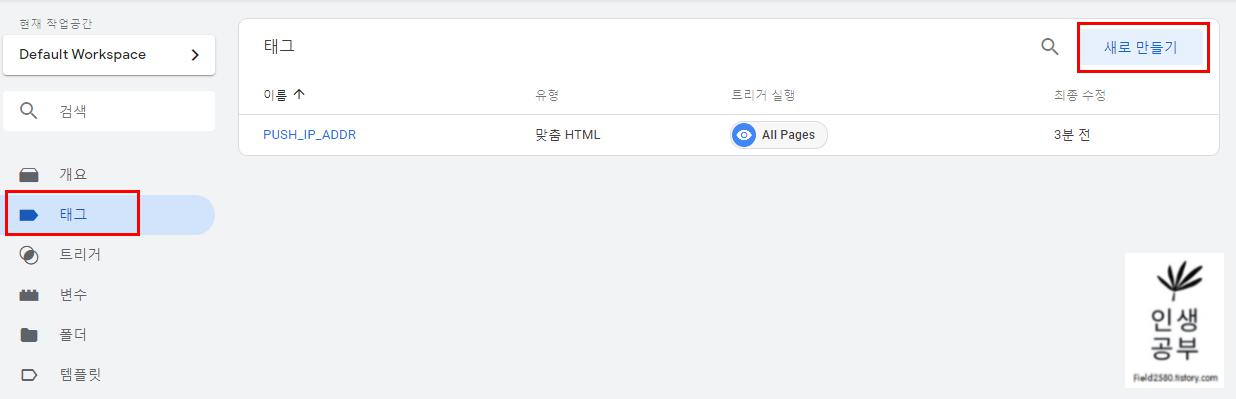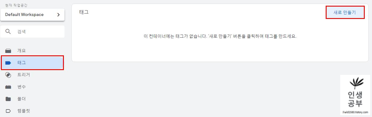 좌측에 태그 메뉴를 선택한 후 새로 만들기 버튼을 눌러줍니다.