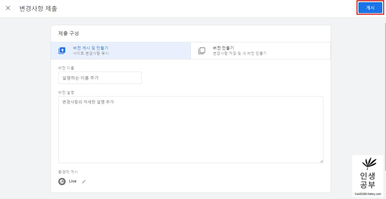 변경사항 제출이 뜨면 우측 최상단에 있는 게시 버튼을 눌러주시면됩니다.