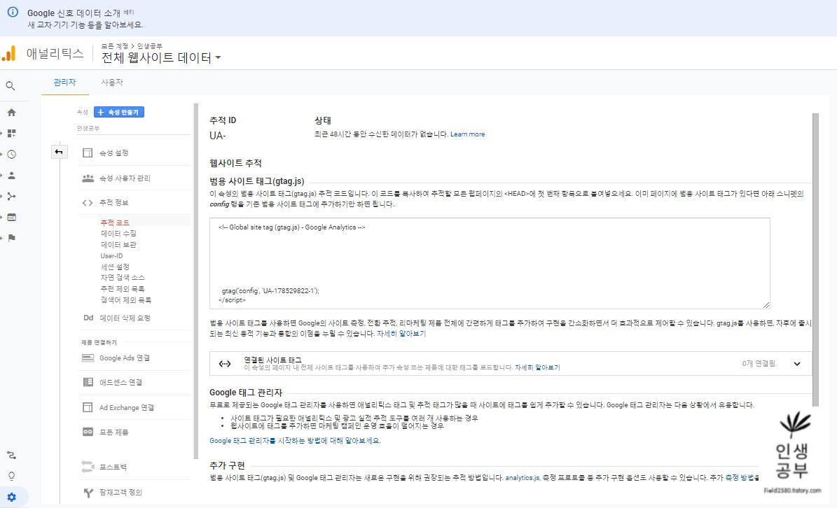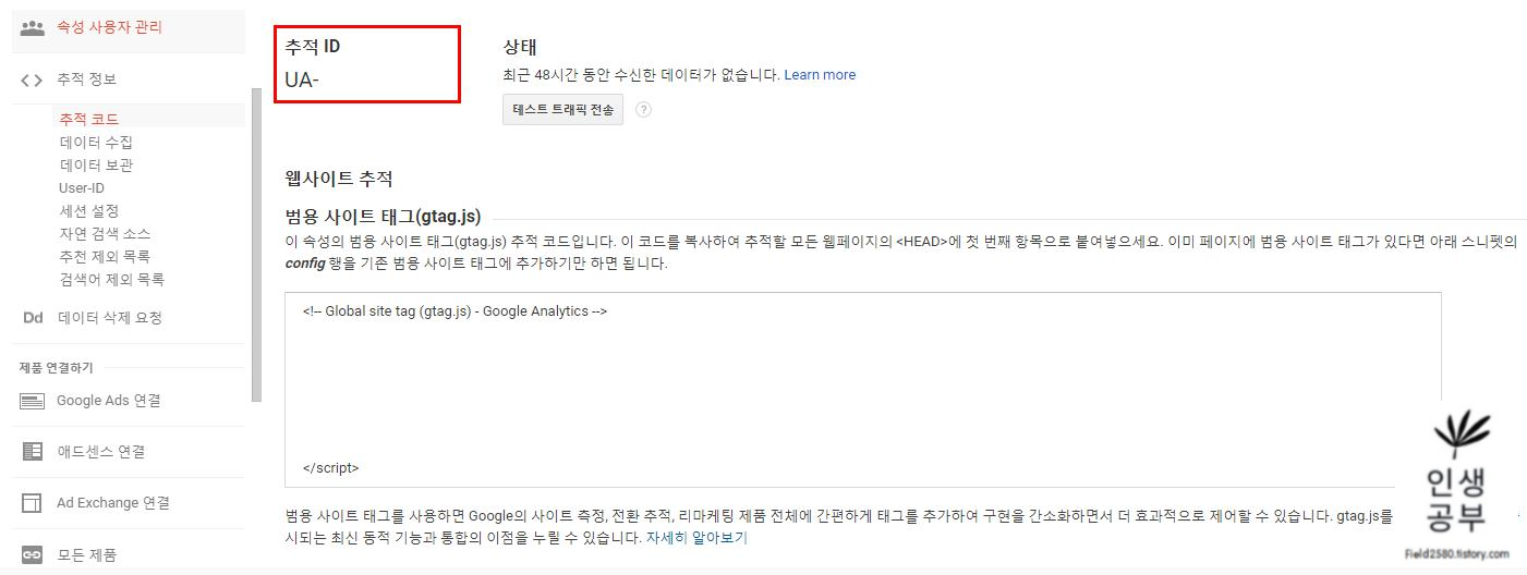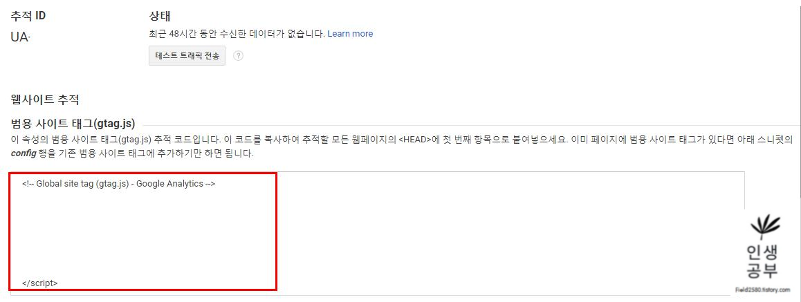 웹 사이트 추적 아래에 있는 범용 사이트 태그를 내 블로그 HTML항목 중에 <Head> 아래에 붙여넣기 해주어야합니다.
