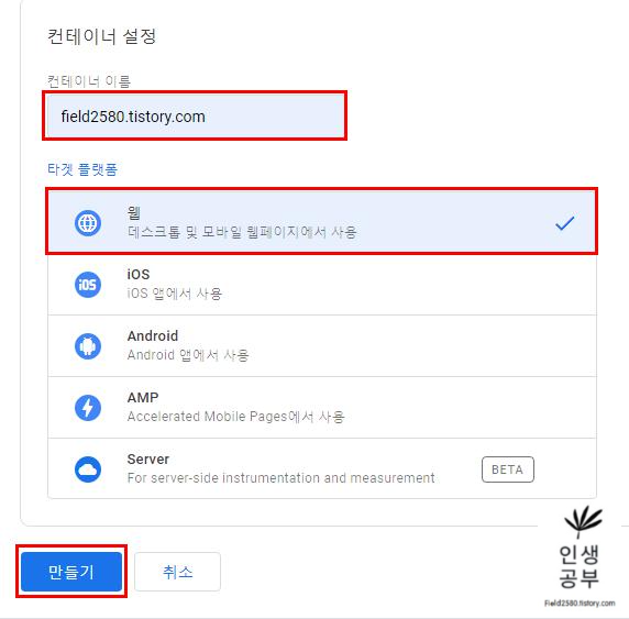 컨테이너 이름에는 블로그 주소를 입력해줍니다. 타겟 플랫폼은 웹을 선택해주시면됩니다. 그 후 만들기 버튼을 눌러줍니다.