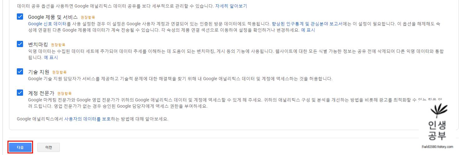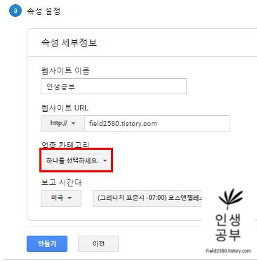 구글 애널리틱스 계정을 만들어야합니다. 계정 이름은 아무거나 지으셔도 되지만 알기쉽게 저는 제 블로그 이름으로 정했습니다. 추후에 블로그를 더 만들게되면 혼동을 줄 수 있으므로 블로그 이름이나 사이트 이름으로 하시는 것을 추천해드립니다.
