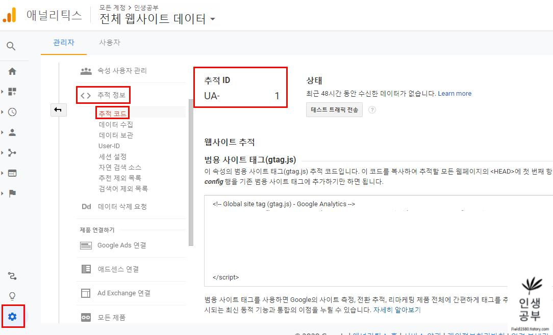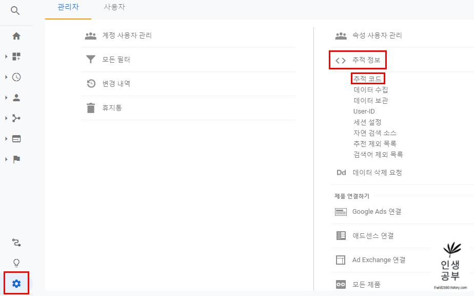 추적 ID를 확인하는 방법은 애널리틱스 설정(톱니바퀴 모양)에서 추적정보 -> 추적코드를 누르면 추적 ID가 나옵니다. 추적 ID를 복사해줍니다.