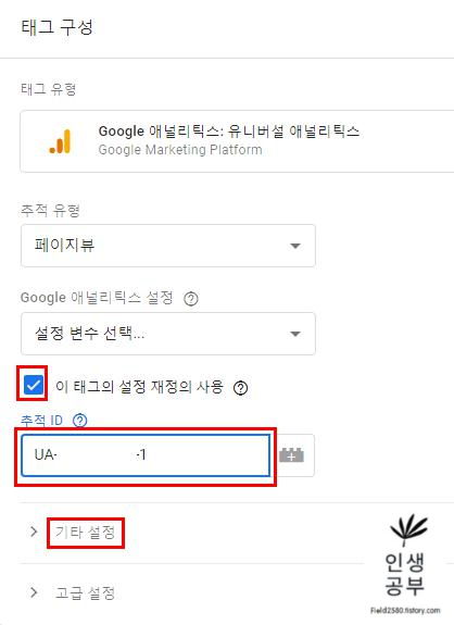 이 태그의 설정 재정의 사용 앞에 체크해주시고 추적 ID 아래에는 방금 복사한 추적 ID를 붙여넣기 해줍니다. 그리고 기타설정을 눌러줍니다.