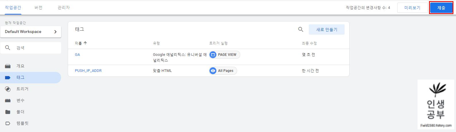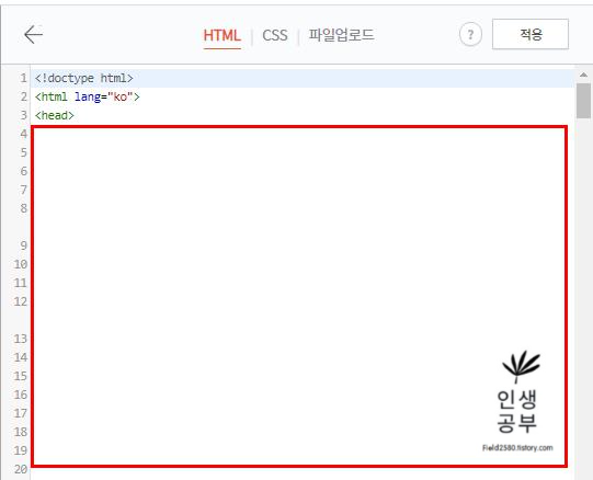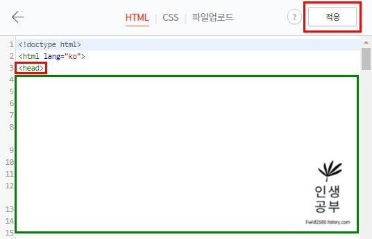 태그를 제대로 복사붙여넣기 했으면 우측 상단에 있는 적용 버튼을 눌러줍니다.