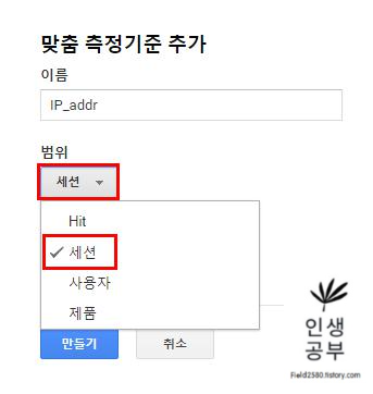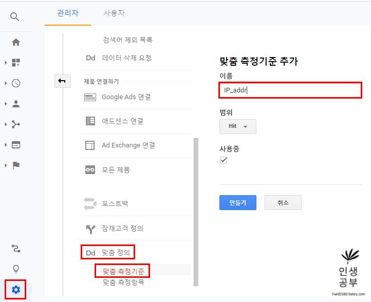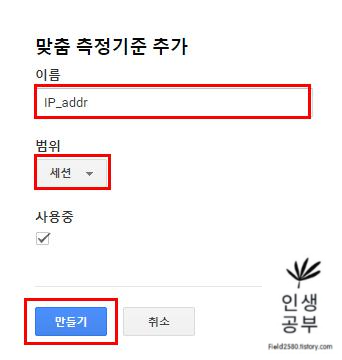 맞춤 측정기준 추가 화면이 나오면 이름은 Ip_addr로 만들어 줍니다.