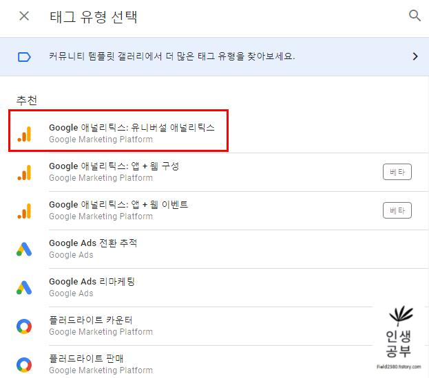 태그 유형 선택이 나오면 추천 최상단에 있는 Google 애널리틱스 : 유니버셜 애널리틱스를 선택해줍니다. 이 곳에서 추적 ID를 입력해야하는데 애널리틱스에 있는 추적 ID를 입력하셔야합니다.