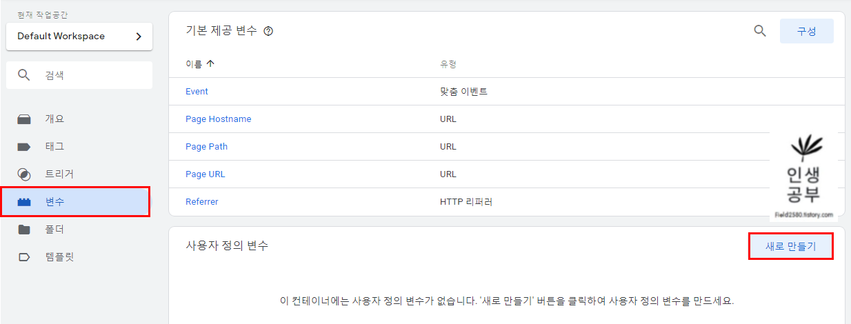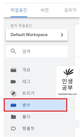 좌측 메뉴에서 변수 버튼을 눌러줍니다.