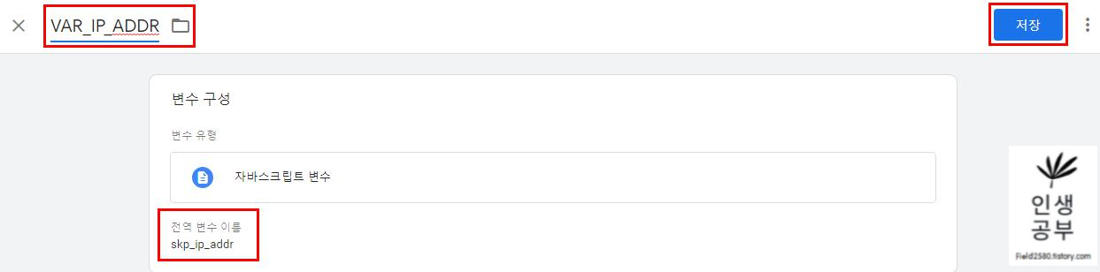 좌측 최상단에 이름을 VAR_IP_ADDR 을 입력해줍니다. 아래에 변수 이름을 skp_ip_addr로 입력해준 후 저장 버튼을 눌러줍니다.