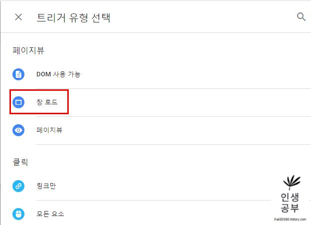 트리거 유형선택에서 창 로드를 선택해줍니다.