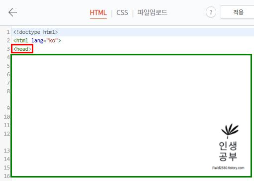<head> 바로 아래 복사해주었던 태그를 붙여넣기 해줍니다. (초록색 네모칸 안)