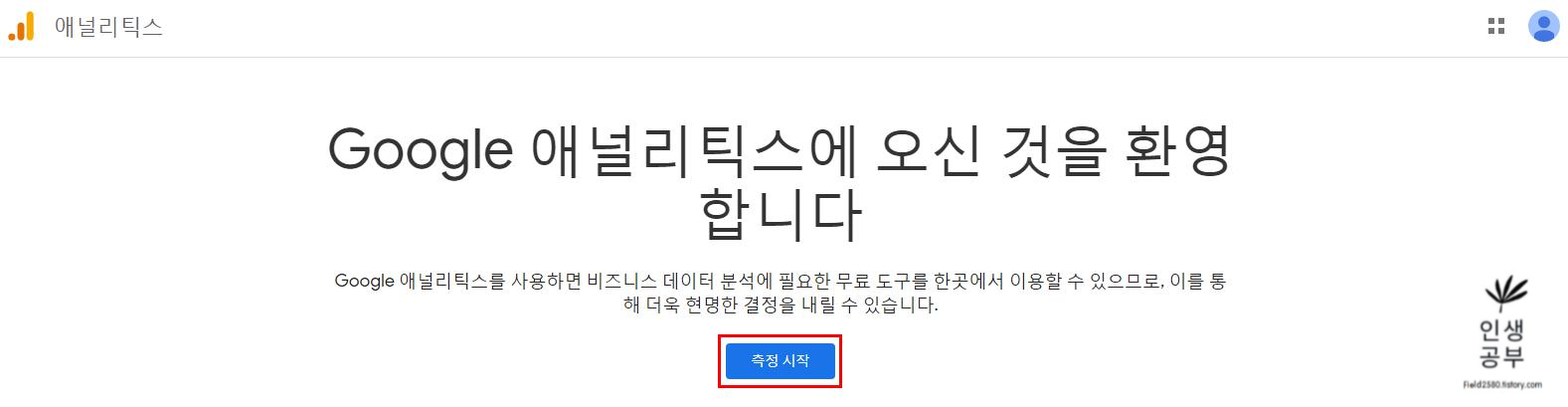 구글 애널리틱스에 접속해줍니다. 구글 아이디로 로그인한 후, 중앙에 있는 측정시작을 눌러줍니다.