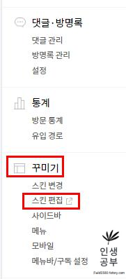 꾸미기 -> 스킨편집을 눌러줍니다.