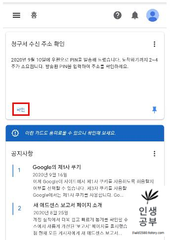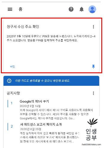 | 구글 애드센스 핀(PIN)번호 주소 확인하는 방법 (0) | 2020.09.30 |