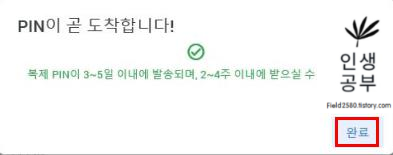 복제 PIN이 3~5일 이내에 발송되며, 2~4주 이내에 받으실 수 있습니다. 라는 안내창이 뜹니다. 완료 버튼을 눌러주시면 PIN 재발송 완료됩니다.