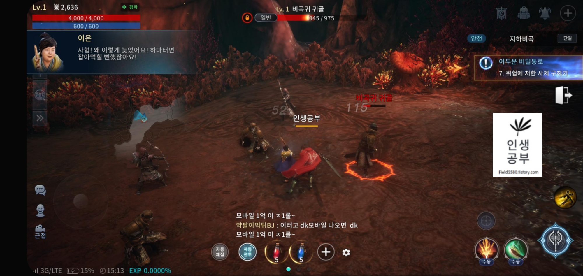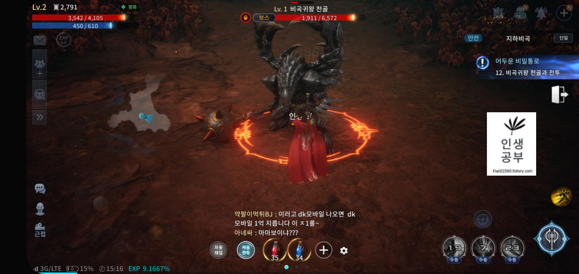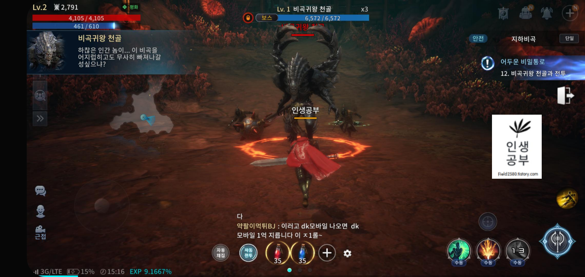 그래픽이 정말 좋습니다. 일반 모바일 게임에서와 같이 우측에 퀘스트가 뜨고 우측 퀘스트 버튼을 누르면 자동으로 캐릭터가 해당 위치로 이동하고 공격까지 합니다.
