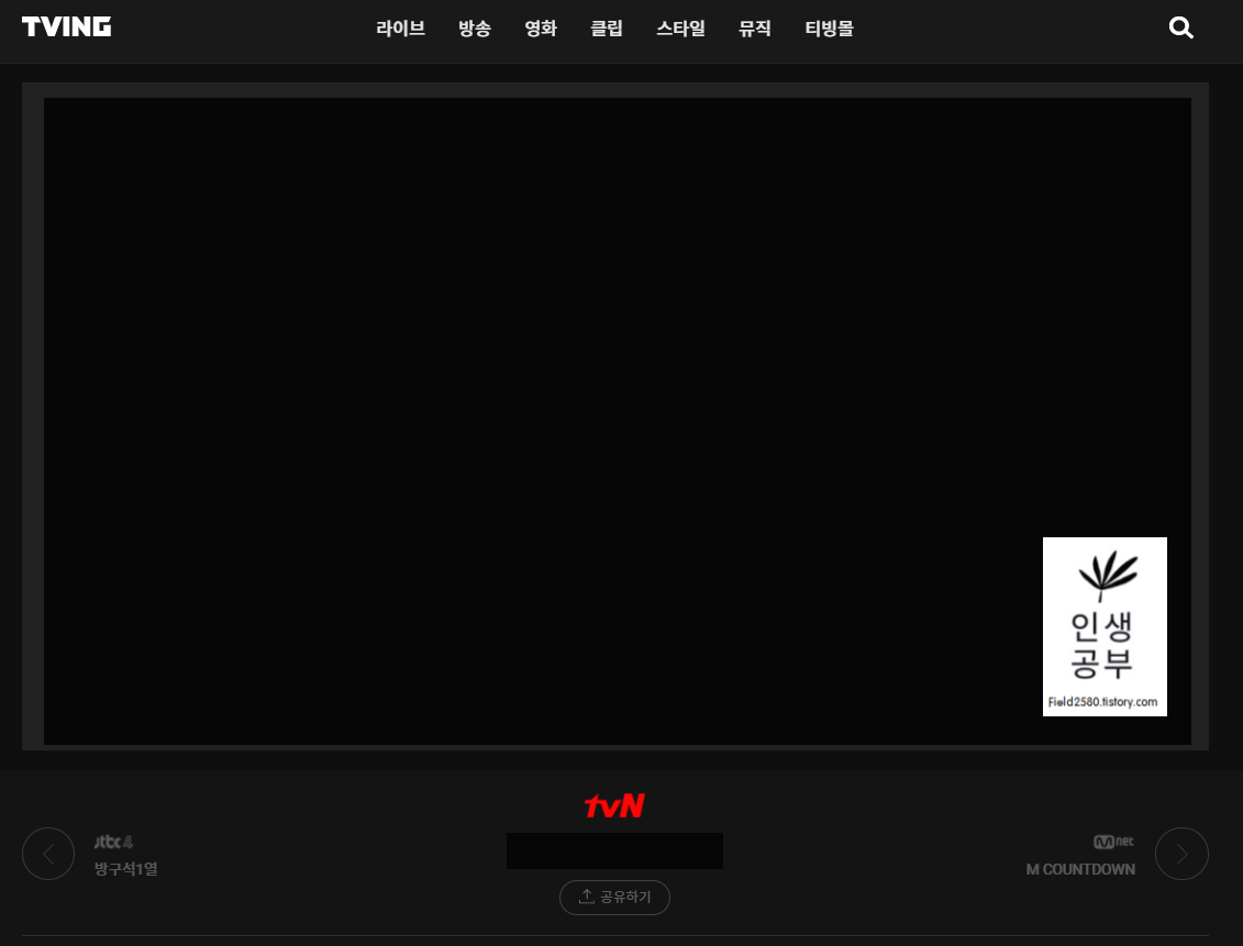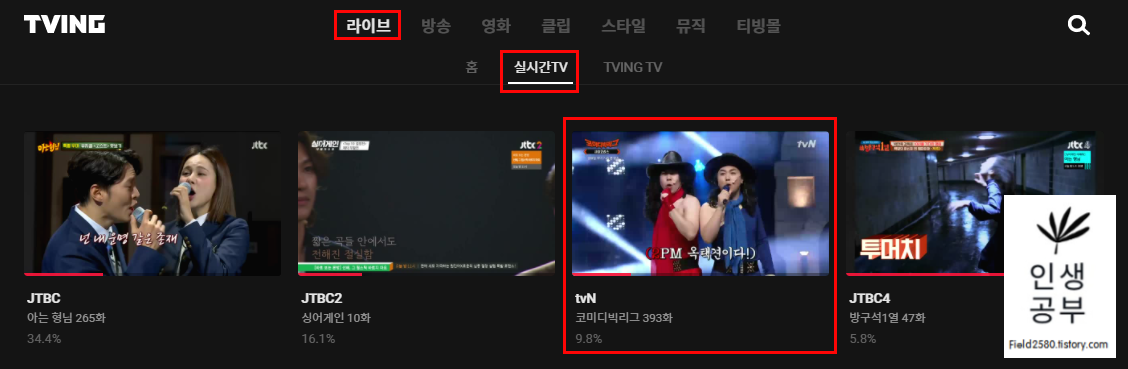 로그인한 후, 상단에 있는 라이브 메뉴를 누르고, 실시간TV 버튼을 눌러주세요. 티빙에서 볼 수 있는 실시간 채널들이 있는데 tvN 채널을 찾아서 눌러주세요.