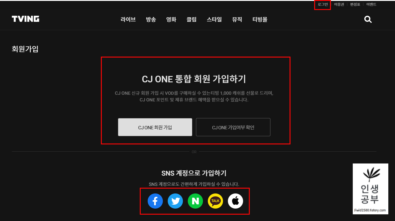 다음과 같이 티빙 홈페이지 화면이 뜹니다. 티빙 홈페이지를 통해서 윤스테이 실시간을 보실 수 있습니다. 티빙 아이디가 없으신 분은 CJ ONE 통합 회원으로 가입할 수 있고, SNS 계정으로도 가입할 수 있습니다. 아이디가 있으신 분은 우측 상단에 있는 로그인 버튼을 눌러주세요.